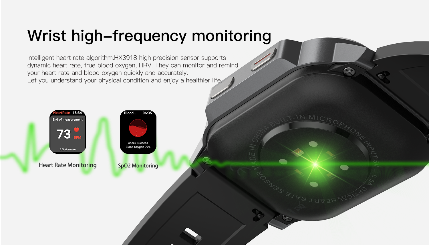 | Senzori | HX3918 Inaltă precizie pentru funcții precum ritm cardiac dinamic, oxigen din sânge, HRV, recunoaștere optică a ritmului cardiac și a corpului. |